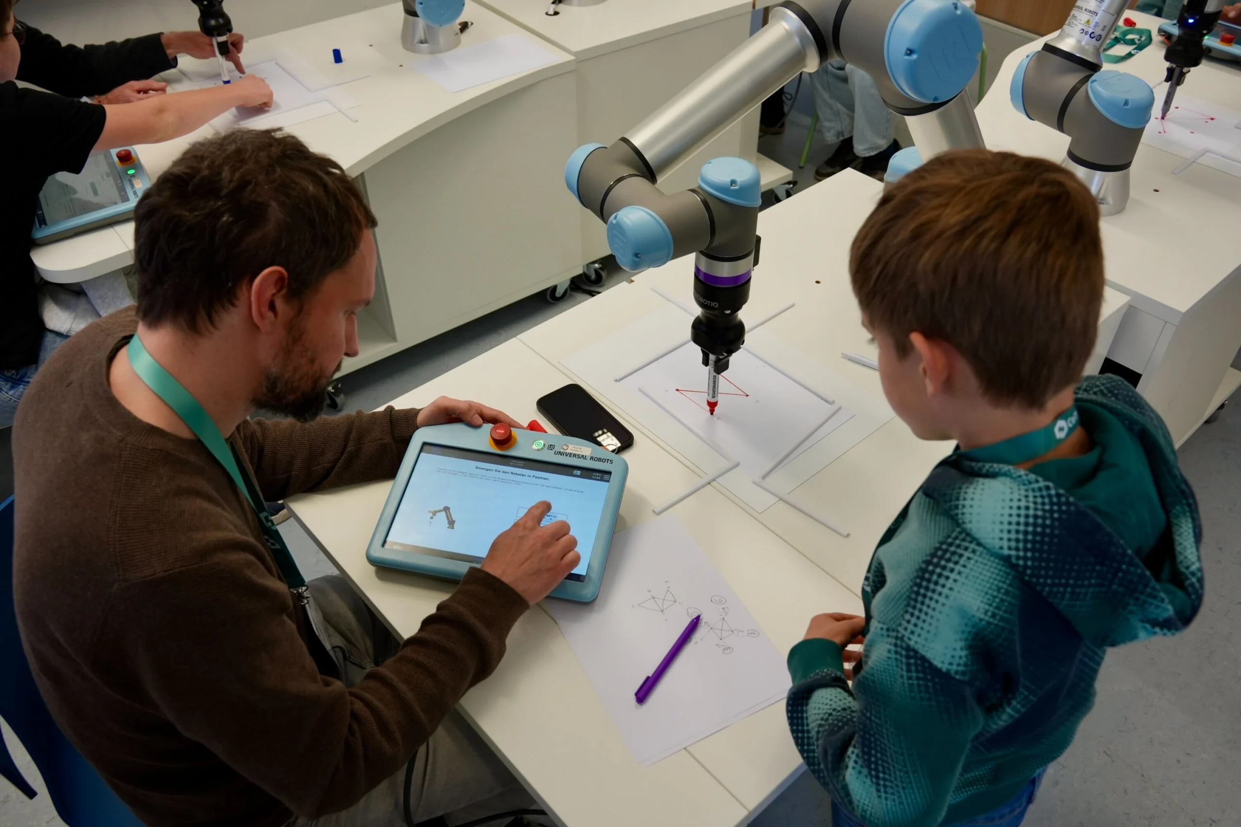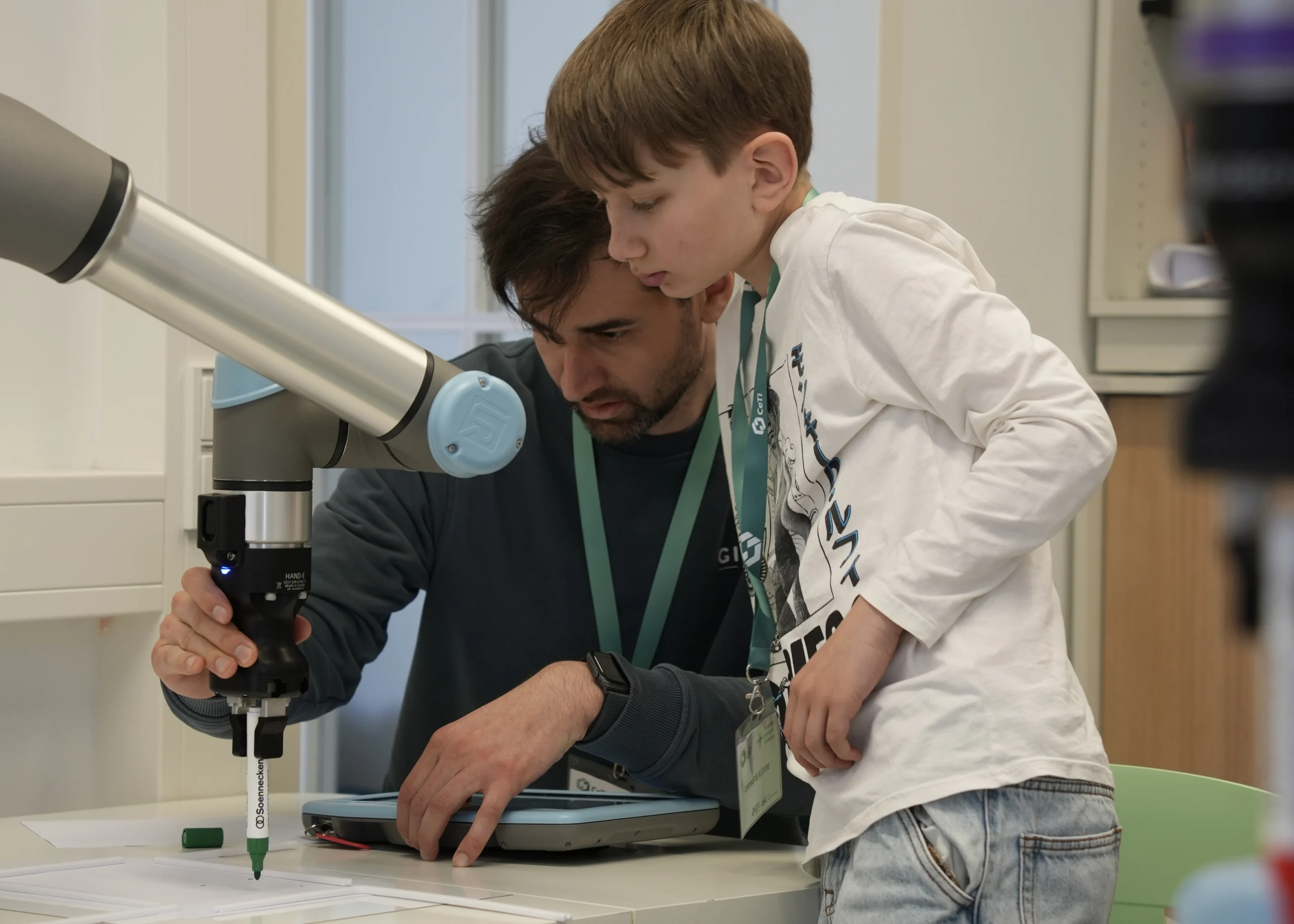 The heart of the session centered on our Cobots from Universal Robots. These collaborative robots provided the perfect entry point for young tech enthusiasts and their parents to experiment with high-end technology in a safe, intuitive environment. From the first moment of “lead-through” programming, where participants physically guided the robotic arms to teach them movements, to the successful execution of complex tasks, the room was filled with a sense of shared discovery. It wasn’t just about code; it was about the tactile experience of seeing digital commands translate into precise, physical action.