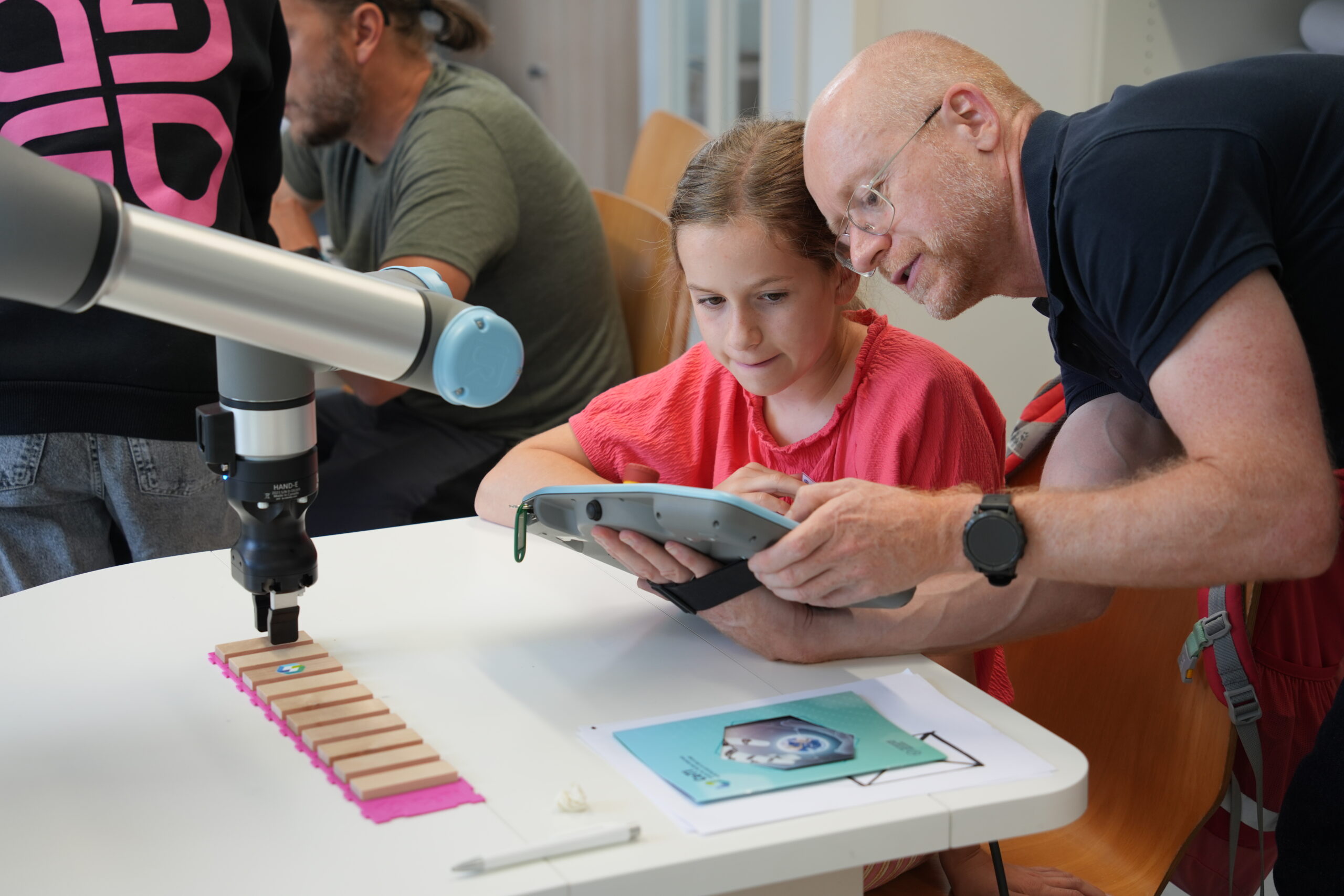 Image of a researcher explaining the functioning of a robotic arm to children
